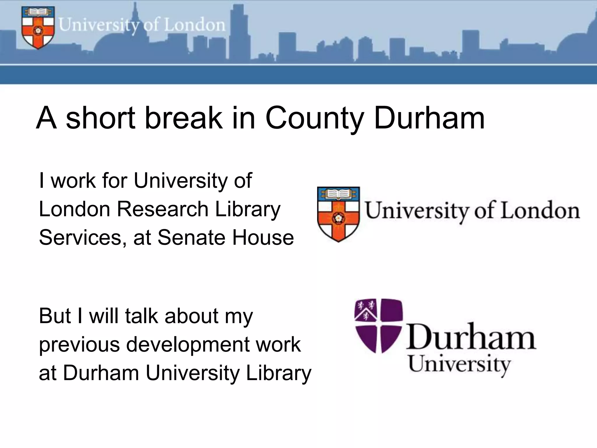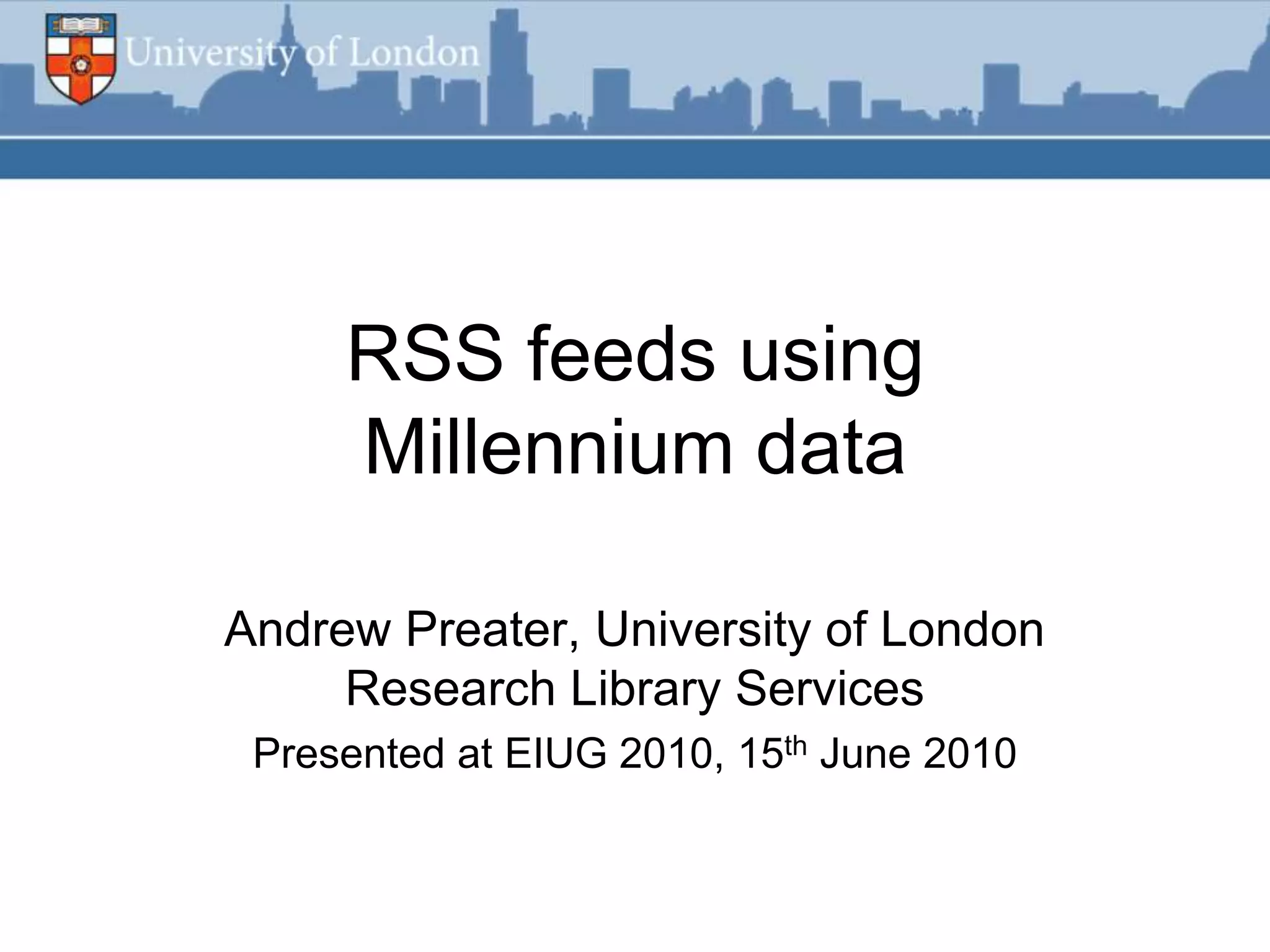 This document summarizes an RSS feed project at Durham University Library to automatically export new book metadata from their Millennium system into an RSS feed. The project aimed to minimize staff maintenance effort while providing a standards-compliant, automated way for readers to access new titles. Perl scripts processed the exported flat file data, loaded it into a MySQL database, and generated valid RSS XML. The finished product provided HTML and feed reader views of new titles that were refreshed weekly with minimal effort. Lessons learned included using Unicode, validating RSS, and the potential for more automation.