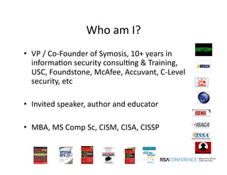 The document outlines the importance of security training in organizations, detailing the potential impacts of security breaches including financial loss and damage to reputation. It emphasizes the necessity of structured training programs to enhance employee awareness and compliance with security policies, driven by various regulations including PCI, HIPAA, and GLBA. Additionally, the document discusses methods for developing effective training programs, assessing organizational needs, and evaluating training effectiveness.
