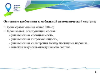 Документ описывает создание мобильной автоматической системы для подавления взрыва метана в шахтах, с ключевыми требованиями к времени срабатывания и характеристикам огнетушащего состава. Участвуют международные исследовательские группы для разработки и испытания нового порошкового состава 'эврика-итх'. Для реализации проекта требуется 37 млн рублей и команда профессионалов для выхода на мировой рынок.