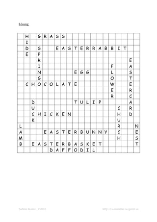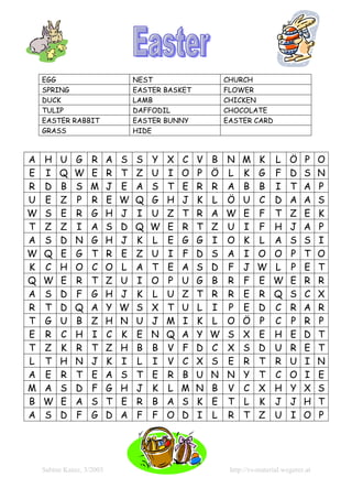 The document contains a word search puzzle with Easter-related terms hidden throughout. Some of the hidden terms include egg, nest, church, tulip, daffodil, chocolate, Easter rabbit, Easter bunny, and Easter basket. Solving the puzzle likely reveals all of the hidden Easter vocabulary.
