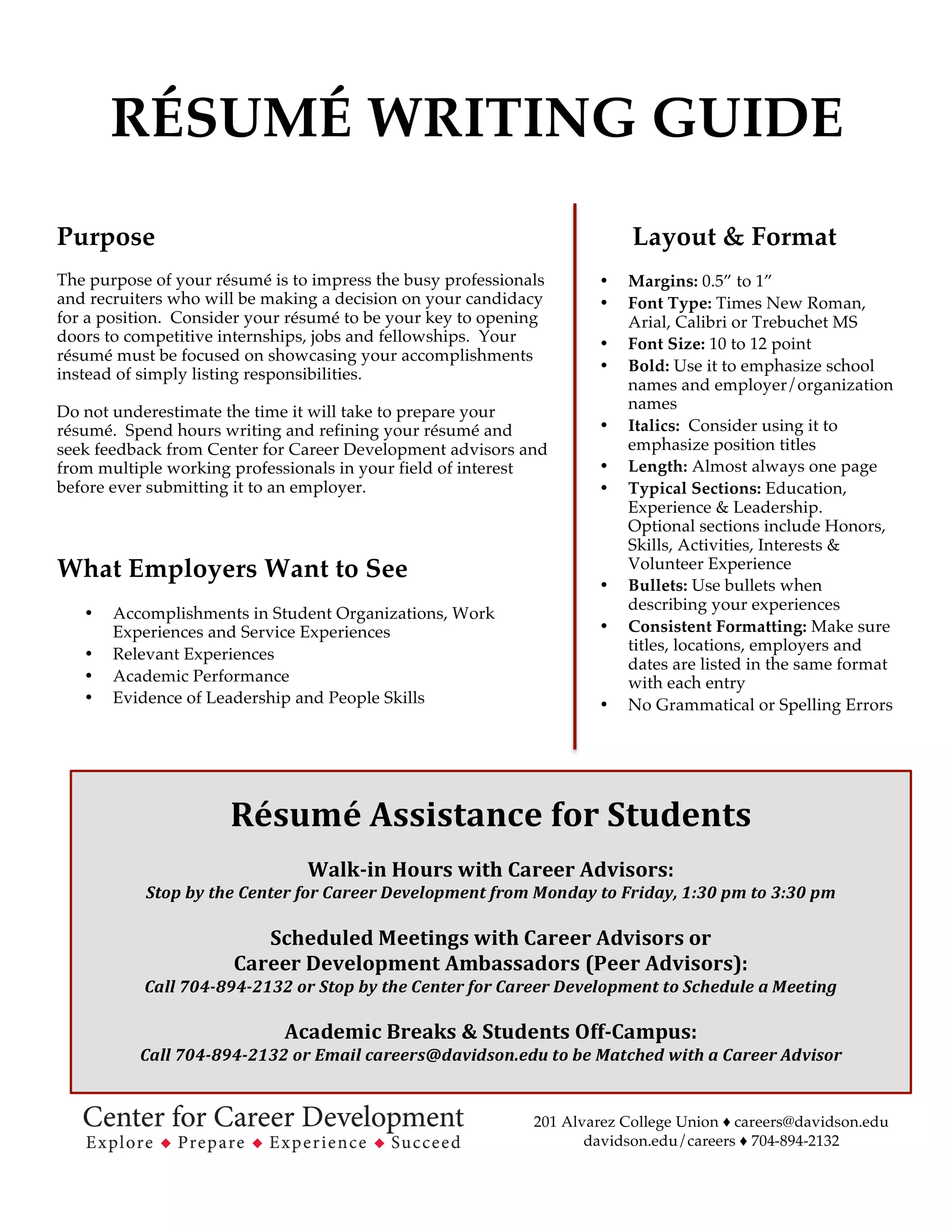 The document provides guidance on creating an effective resume, including the purpose, what employers want to see, proper formatting, and sections to include. It emphasizes highlighting accomplishments, relevant experiences, and leadership skills. The resume should be focused, error-free, and consistently formatted. Alternative resume formats are suggested for certain creative fields, along with accompanying materials like portfolios, videos, or blogs.