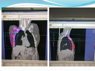 1) The document discusses various techniques for radiation therapy treatment planning and delivery for breast cancer, including tangential field planning, supraclavicular field matching, electron boosts, and accelerated partial breast irradiation.