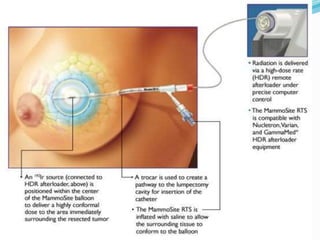 3) Factors that determine suitability for accelerated partial breast irradiation include patient age, tumor size and characteristics, and nodal involvement. Dosage schedules and advantages and disadvantages of different techniques are also reviewed.