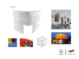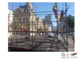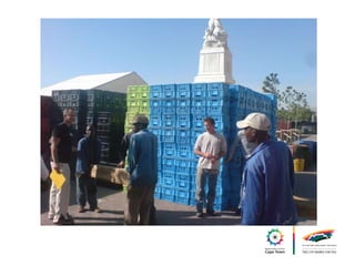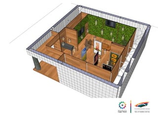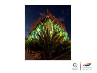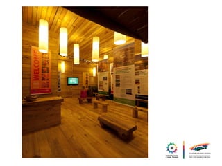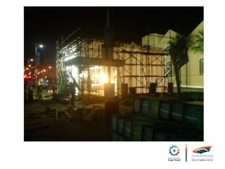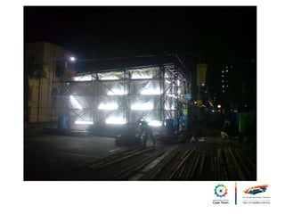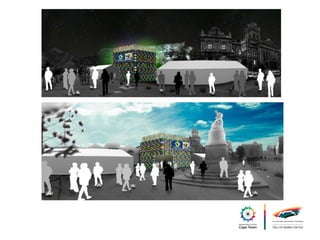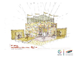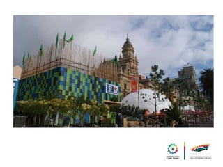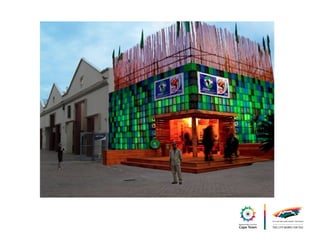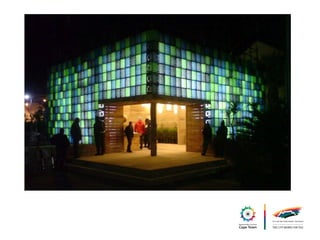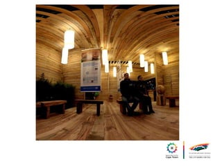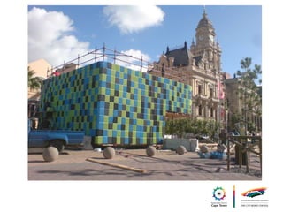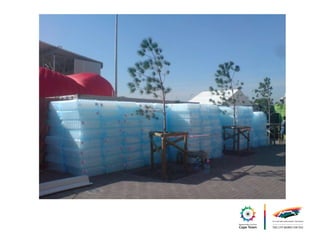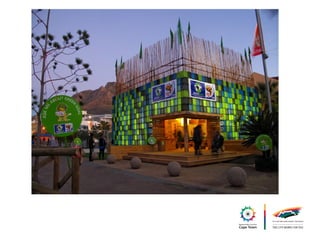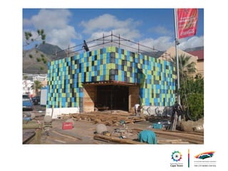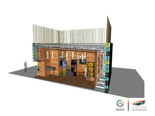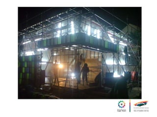 Visuals of the Responsible Tourism in Cities pavilion to be erected at Tourism Indaba 2011 in Durban, South Africa (7-10 May). This is an architecturally iconic structure specifically designed to demonstrate the use of materials that are either recycled, reused, reclaimed, or newly purchased, but earmarked for reuse afterwards. Includes visuals of design, materials, construction and completion.