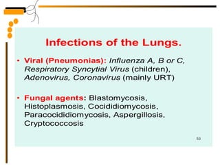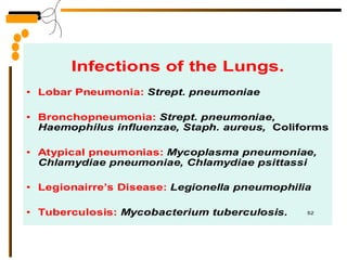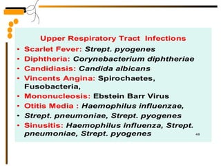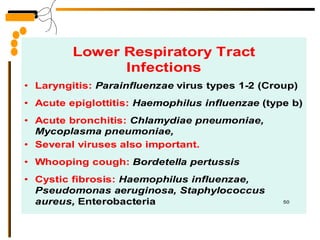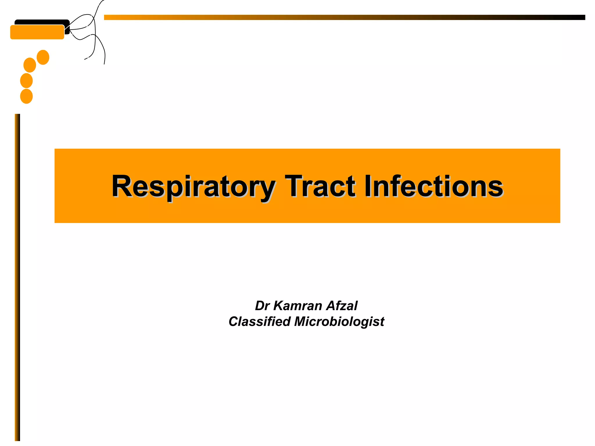 The document provides guidelines for collecting and transporting respiratory tract specimen for various infections, including proper labeling and storage. It describes common respiratory tract infections like pneumonia, their causes, symptoms, and treatment options. Pneumonia is classified as lobar, bronchopneumonia, or interstitial based on anatomical location and involvement; and as typical, atypical, community-acquired, or hospital-acquired based on etiology.