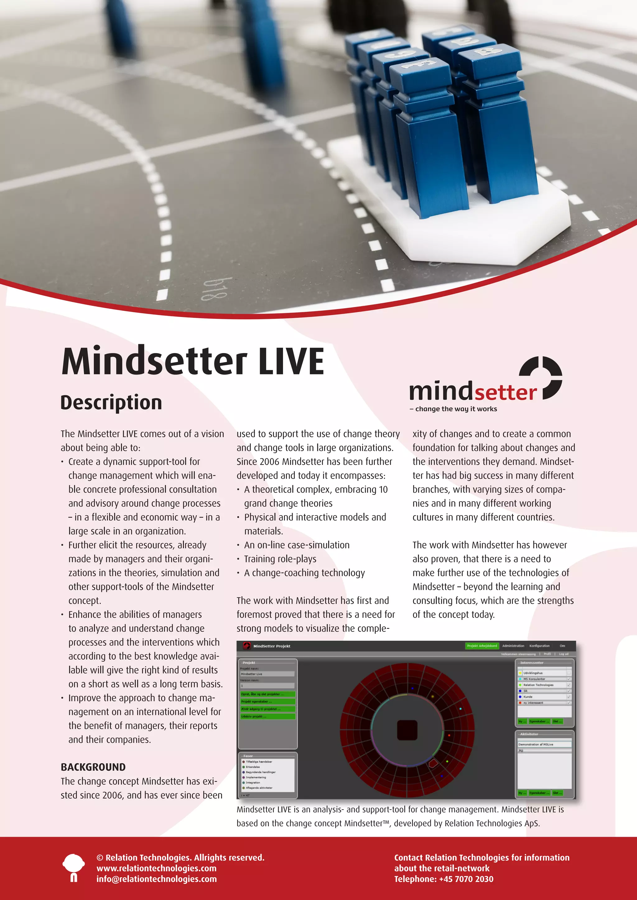 Mindsetter LIVE is an analysis and support tool for change management based on the Mindsetter change concept. It allows users to register and process data about change projects, helping them qualify data by reflecting on relevance, realism, and labeling. Mindsetter LIVE could potentially advise, coach, and support users; provide a data collection platform; and track development in change processes. The tool aims to give managers flexible access to Mindsetter's knowledge and models to enhance individual analysis of stakeholders and changes.