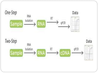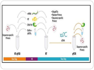 Reverse transcription polymerase chain reaction (RT-PCR) is used to quantify RNA levels in a sample. It involves first synthesizing cDNA from RNA using reverse transcriptase. Real-time PCR then monitors the amplification of this cDNA in real-time using fluorescence, allowing for both amplification and quantification. It has several advantages over traditional PCR, including being faster and allowing for truly quantitative analysis of gene expression levels. The process involves reverse transcribing RNA to cDNA, then amplifying and detecting this cDNA using fluorescence across multiple temperature cycles.