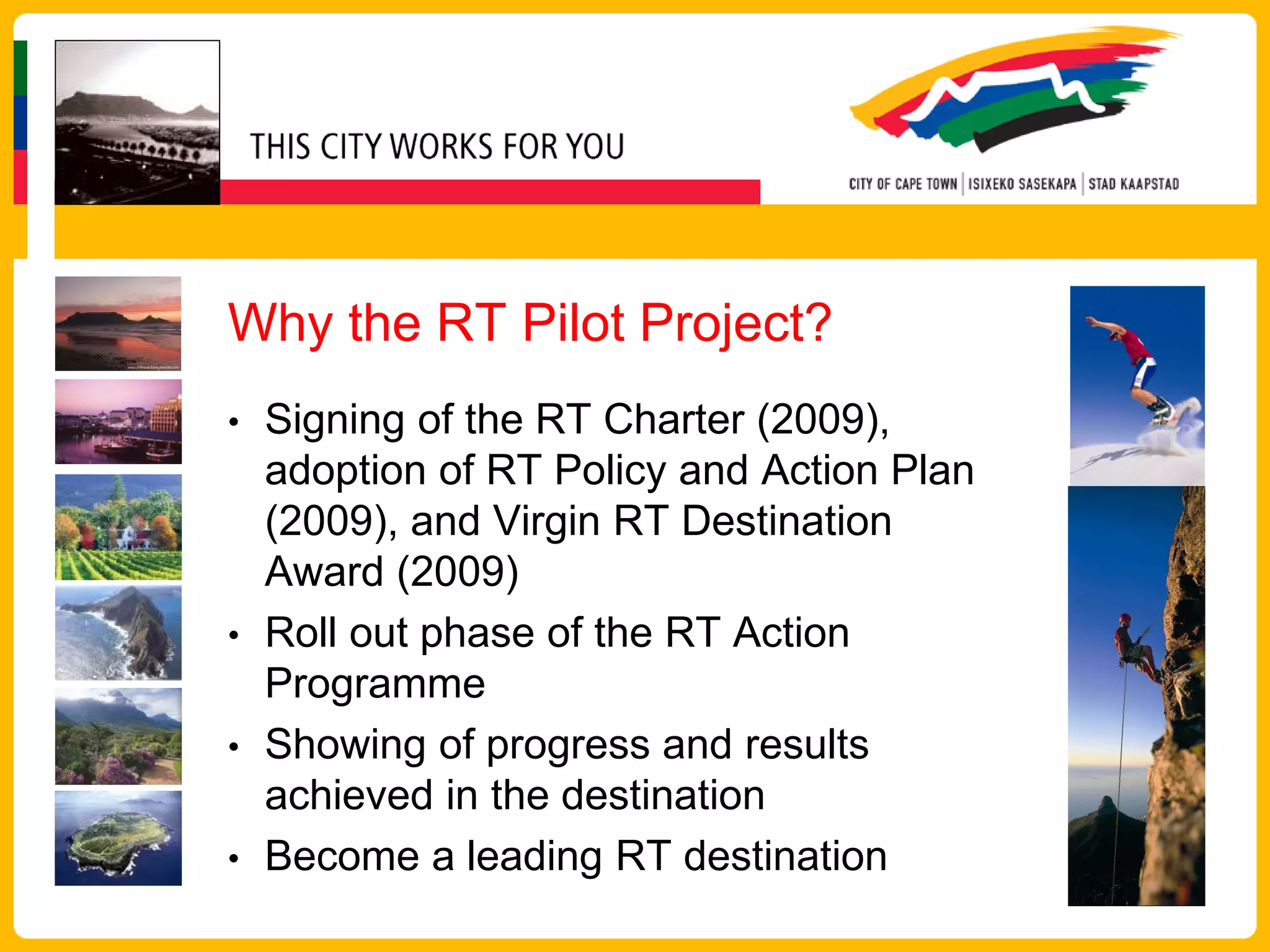 The Responsible Tourism (RT) pilot project launched in 2011 aims to monitor and promote responsible tourism practices in Cape Town by involving various tourism enterprises. With a focus on seven key indicators such as water conservation and energy efficiency, the project encourages collaboration among stakeholders to establish a framework for improved practices. Participants benefit from showcasing their achievements, receiving ongoing support, and gaining eligibility to use the RT charter and logo in their marketing efforts.
