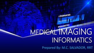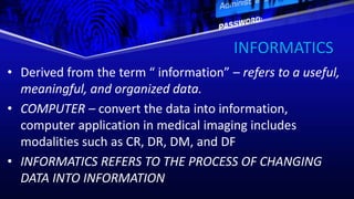 Medical imaging informatics refers to the application of information technology to medical imaging. It involves tasks like digital image acquisition, processing, display, storage, archiving, computer networking, and image transmission. Biomedical imaging uses techniques like X-rays, CT, PET, ultrasound, optical and MRI imaging to non-invasively examine the structure and function of living bodies. Medical imaging informatics is a subfield of radiology that manages digital images and allows sharing of images over computer networks for improved patient care and research.