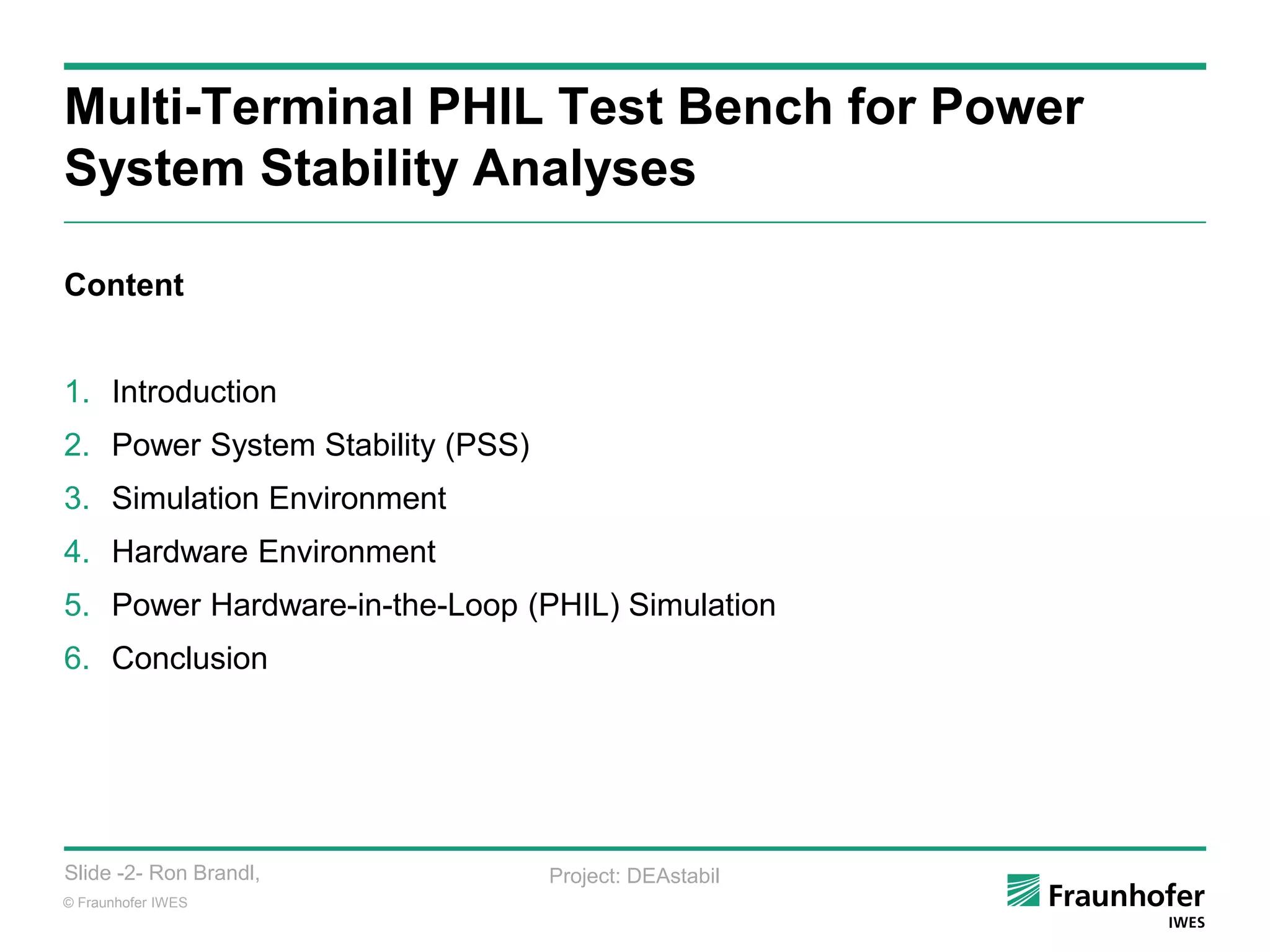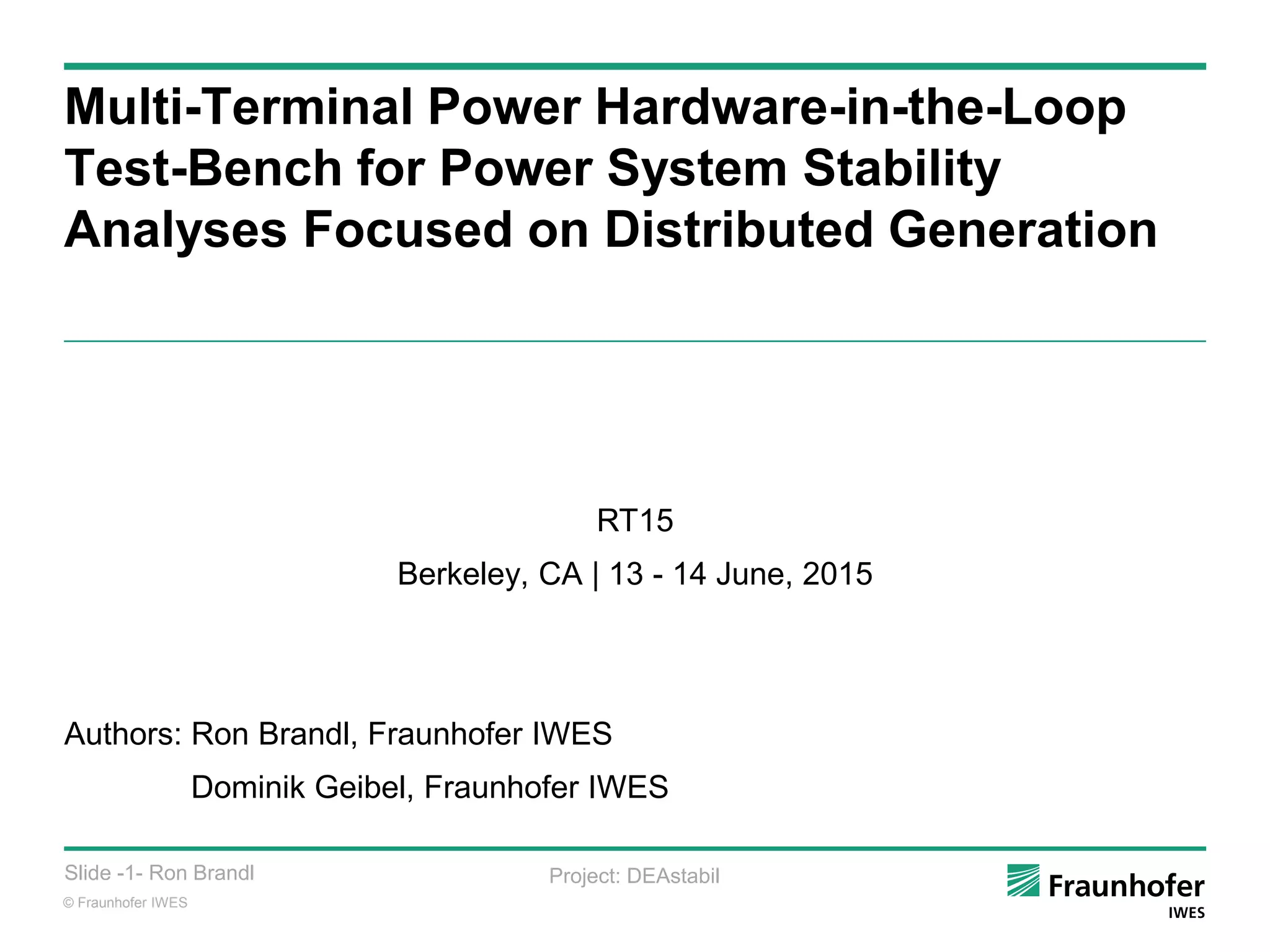 The document discusses the development of a multi-terminal power hardware-in-the-loop test bench for power system stability analyses focused on distributed generation. Large increases in inverter-coupled generators like PV and wind are changing power networks, challenging assumptions of conventional stability assessment. The test bench aims to holistically simulate transmission and distribution networks to evaluate stability with more inverter-based generation. It will integrate real inverters using power hardware-in-the-loop simulations to verify their influence on stability at a higher level of detail than software models alone.