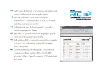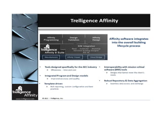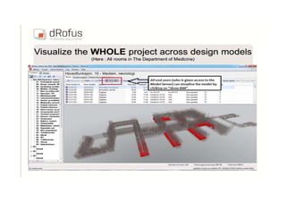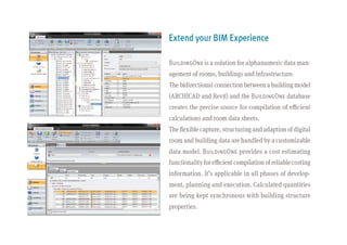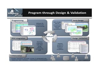 This document discusses space planning technologies (SPT) and their integration with building information modeling (BIM). It describes SPT as software that enables briefing of facilities, integrates briefing data with BIM models, generates reports, analyzes brief vs. design, and exports data downstream. The document outlines typical SPT inputs like spaces, location, functions, and furniture, as well as common outputs like area schedules and room data sheets. It also discusses integrating SPTs like Affinity, BuildingOne, CodeBook, and dRofus with BIM tools like Revit through open standards. The document provides advice on implementation including defining roles and deliverables, designating data authors, and getting training to ensure proper integration of