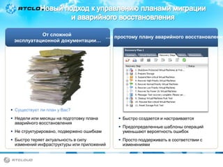 Документ описывает решения для аварийного восстановления в виртуализованных средах, акцентируя внимание на автоматизации и упрощении процессов. Приведены примеры технологий и оборудования, используемых для обеспечения надежной репликации и минимизации потерь данных. Также рассматриваются преимущества использования VMware Site Recovery Manager для управления процессами миграции и аварийного переключения.
