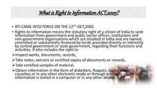 The Right to Information Act, 2005 empowers Indian citizens to access information from government bodies and public authorities to promote transparency and accountability. It establishes a framework for requesting information, outlines the roles of public authorities, and creates penalties for non-compliance with requests. Certain information is exempt from disclosure, particularly those affecting national security and judicial processes.