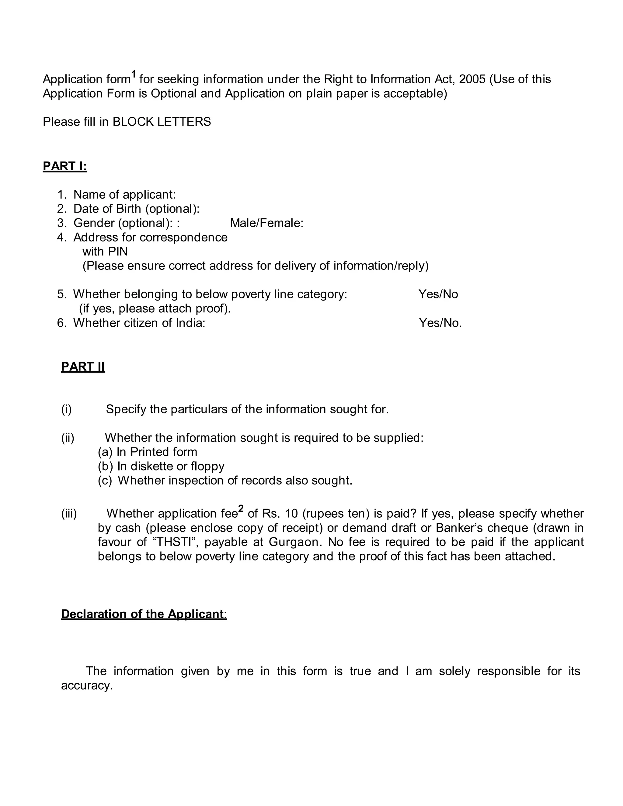 1. The application procedure which allows requests to be submitted in English, Hindi, or the local official language, and includes an application form and option to submit on plain paper.