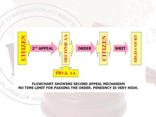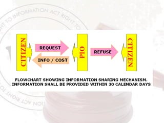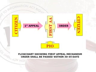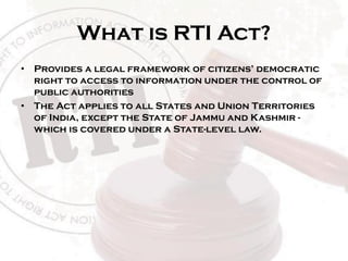 The Right to Information Act provides citizens with a legal framework to access information held by public authorities in India. It applies to all government bodies except in Jammu and Kashmir. Citizens can request information in writing from the Public Information Officer, who has 30 days to respond. Certain information like national security or privacy details are exempt. If unsatisfied with the response, citizens can file appeals internally and then with the state information commission. The goal is to promote transparency and accountability in government.