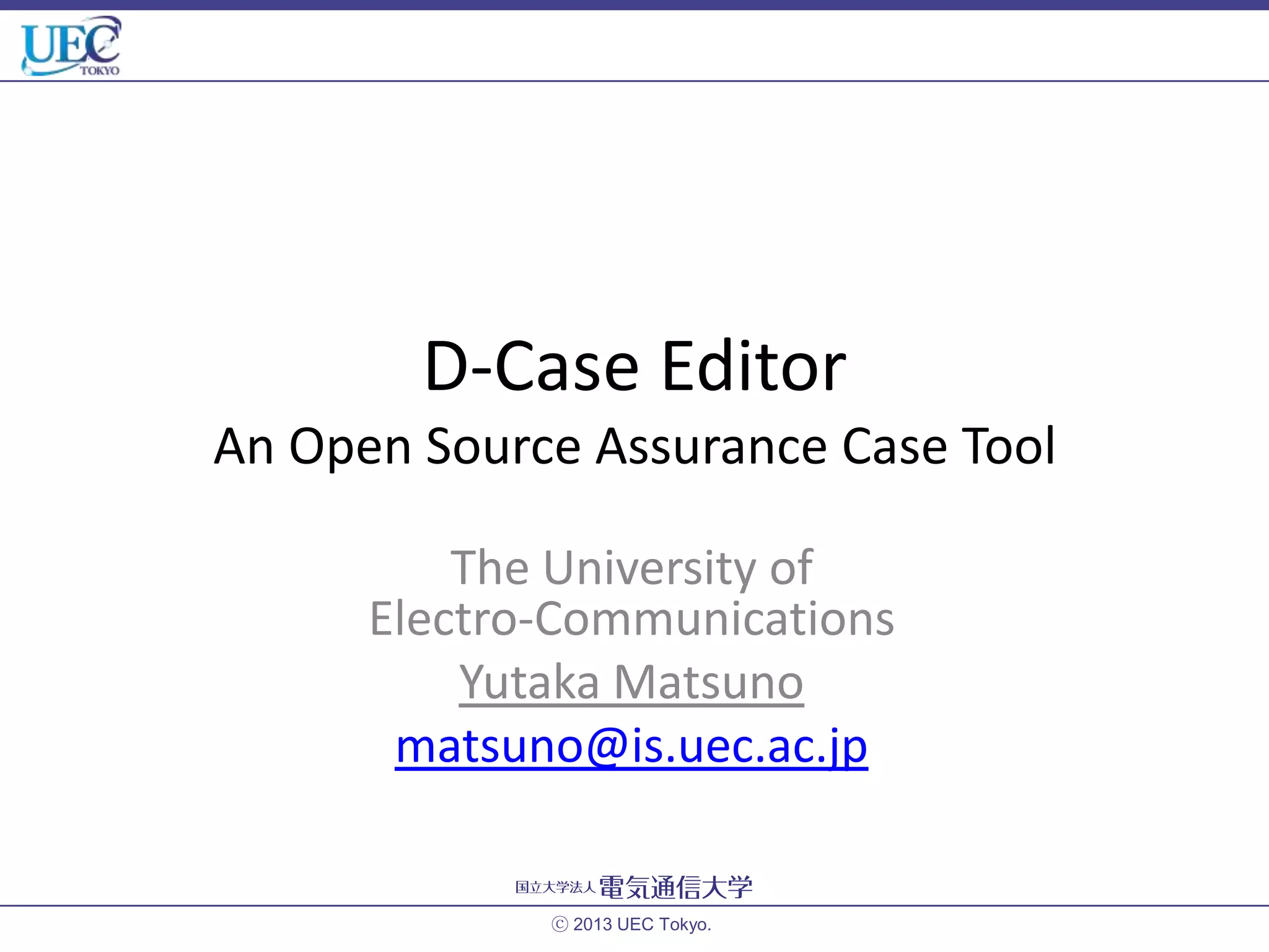 The document discusses the D-Case Editor, an open-source tool for creating assurance cases, emphasizing its role in evidencing system safety in various industries, including automotive and healthcare. It outlines the historical context, compliance with international standards, and the structure of assurance cases, while highlighting the need for effective argumentation and evidence-based practices. Additionally, it covers D-Case's development, functions, and community feedback, stressing the importance of harmonizing tools and standardization in the field.