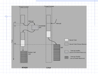 The document discusses real-time operating systems for networked embedded systems. It provides an example of a fire alarm system using sensors, controllers and a central server connected by low-bandwidth radio links. It then discusses the need for a collaborative action routing solution that is dynamic, auto-configurable and minimizes collisions. The document outlines features of real-time operating systems including scheduling, resource allocation, interrupt handling and targeting various processor architectures.