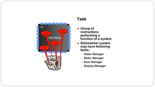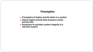 3) RTOSs consider timing constraints like meeting deadlines, and resource constraints like only accessing available resources. Critical tasks must meet deadlines or it can cause catastrophic consequences in hard real-time systems.