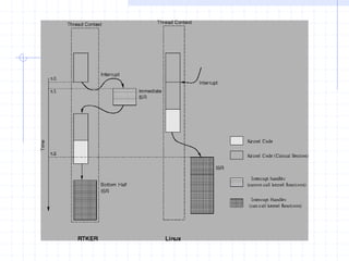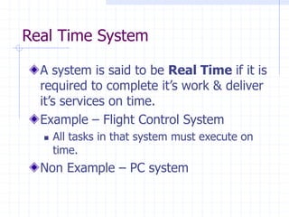 This document discusses real-time operating systems and their features. It defines hard and soft real-time systems, describes common scheduling and resource allocation algorithms used in real-time OSs like priority scheduling and priority inversion solutions. It also discusses Linux for real-time applications and the RTLinux framework, as well as the presenter's own RTOS called rtker which uses a pluggable scheduler and two-level interrupt handling. Other commercial RTOSs mentioned include LynxOS, VxWorks, and pSOS.