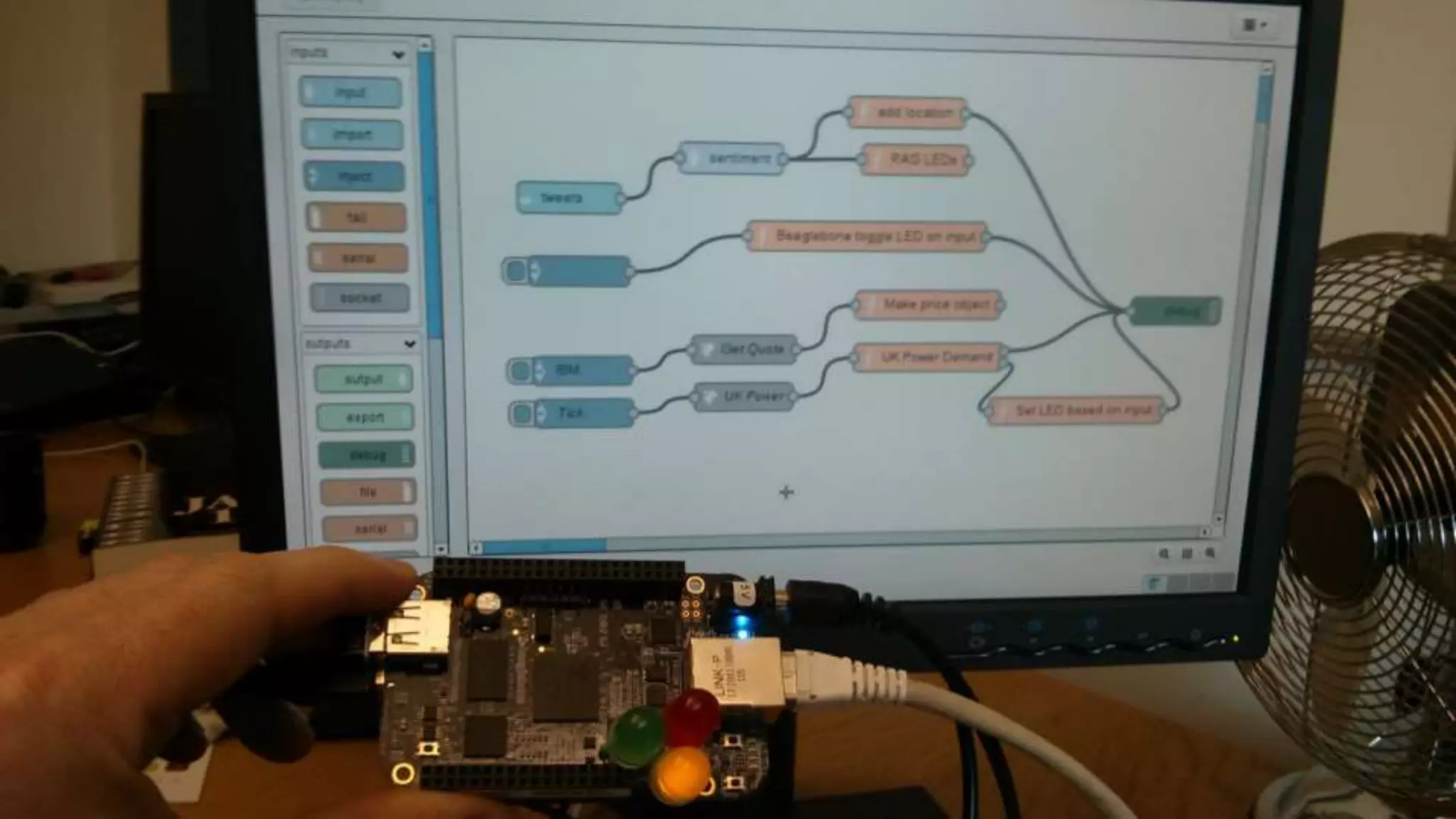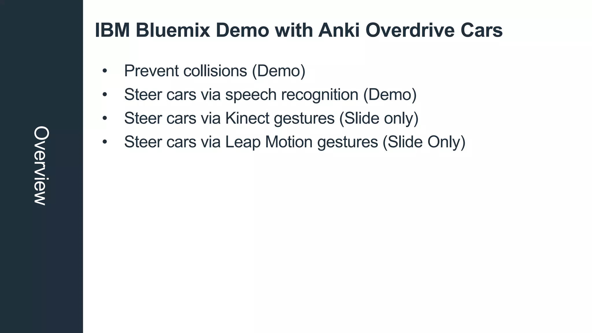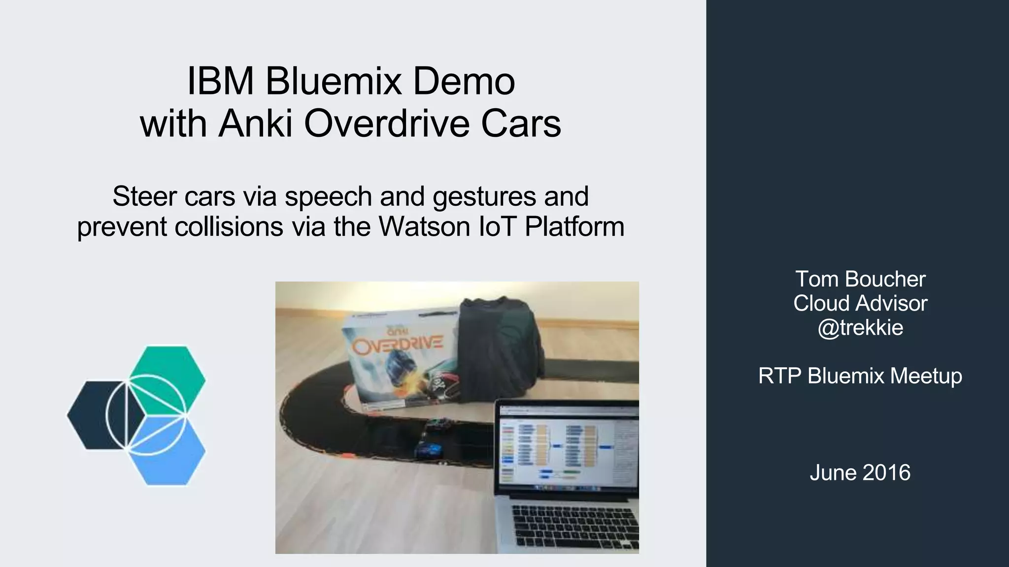 The document discusses an IBM Bluemix demo showcasing Anki Overdrive cars that can be controlled via speech and gestures, while utilizing the Watson IoT platform to prevent collisions. It highlights the importance of tools like Node-RED for developing Internet of Things solutions by easily integrating various device APIs and online services. The demo includes functionalities such as collision prevention, speech recognition, and gesture control using Kinect and Leap Motion technologies.