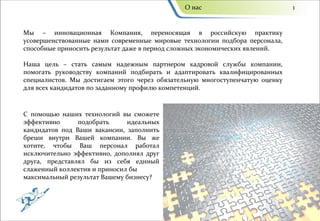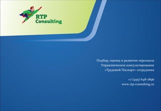 Документ представляет компанию 'РТП Консалтинг', специализирующуюся на подборе и развитии персонала с использованием современных технологий, включая систему 'трудовой паспорт', которая дает полное представление о знаниях и навыках кандидатов. Компания предлагает многоступенчатую оценку соискателей и решение проблем, связанных с подбором и адаптацией сотрудников. Сотрудничая с 'РТП Консалтинг', клиенты получают надежного партнера для эффективного подбора персонала и оптимизации бизнес-процессов.