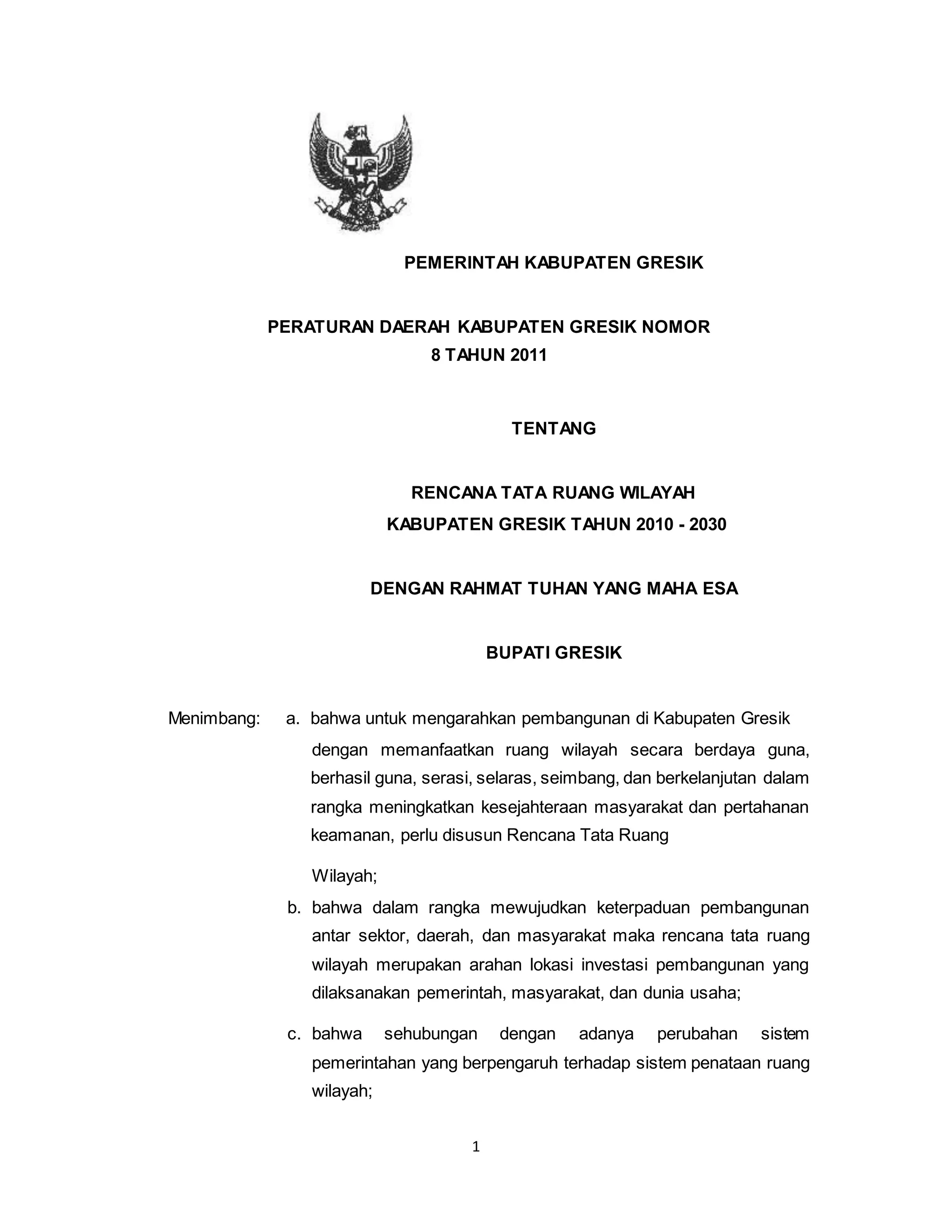 Peraturan Daerah Kabupaten Gresik Nomor 8 Tahun 2011 mengatur rencana tata ruang wilayah Kabupaten Gresik untuk periode 2010-2030, bertujuan meningkatkan kesejahteraan masyarakat melalui pemanfaatan ruang wilayah yang efektif dan berkelanjutan. Hal ini sejalan dengan perubahan sistem pemerintahan dan kebijakan nasional mengenai penataan ruang. Rencana ini juga menjadi panduan bagi investasi pembangunan yang dilakukan oleh pemerintah, masyarakat, dan dunia usaha.