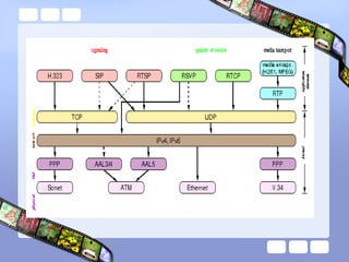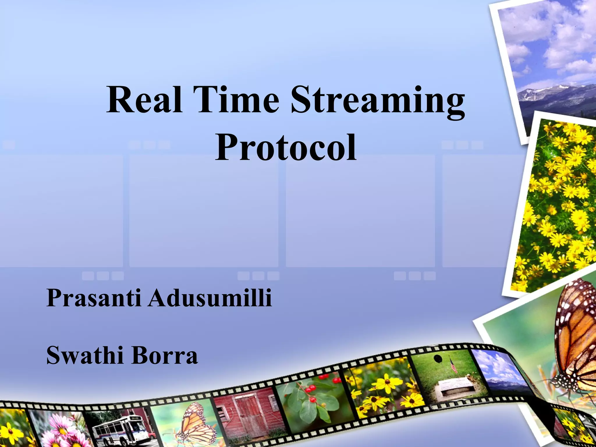 RTSP is a protocol for controlling streaming media. It uses RTP for data delivery and allows VCR-like controls like play, pause, etc. RTSP sits on top of RTP and handles session setup and control, while RTP handles actual media data transport. RTSP messages are similar to HTTP but maintain state between requests and responses unlike stateless HTTP. RTSP enables streaming media playback by requesting media from a server and receiving it as a continuous stream.