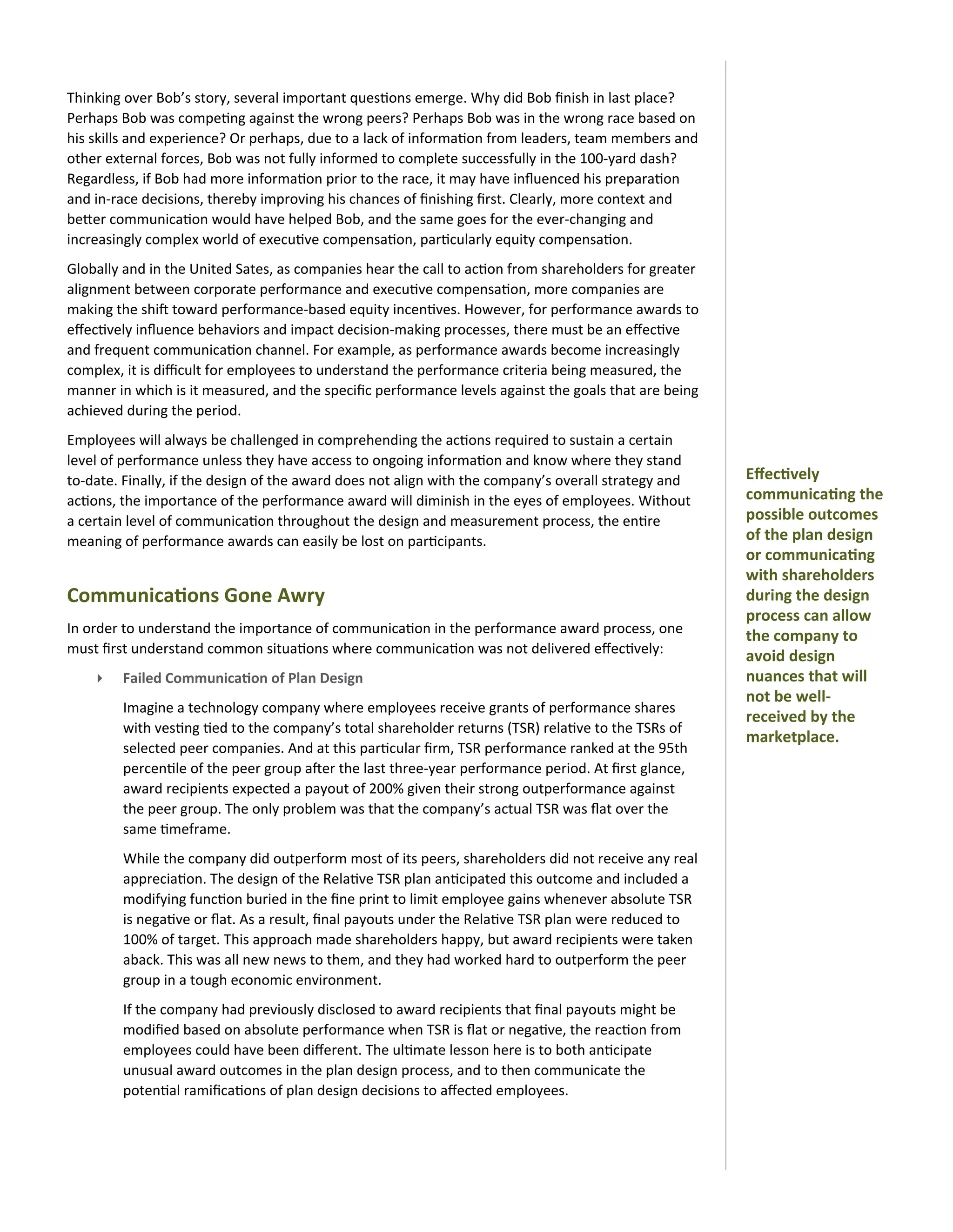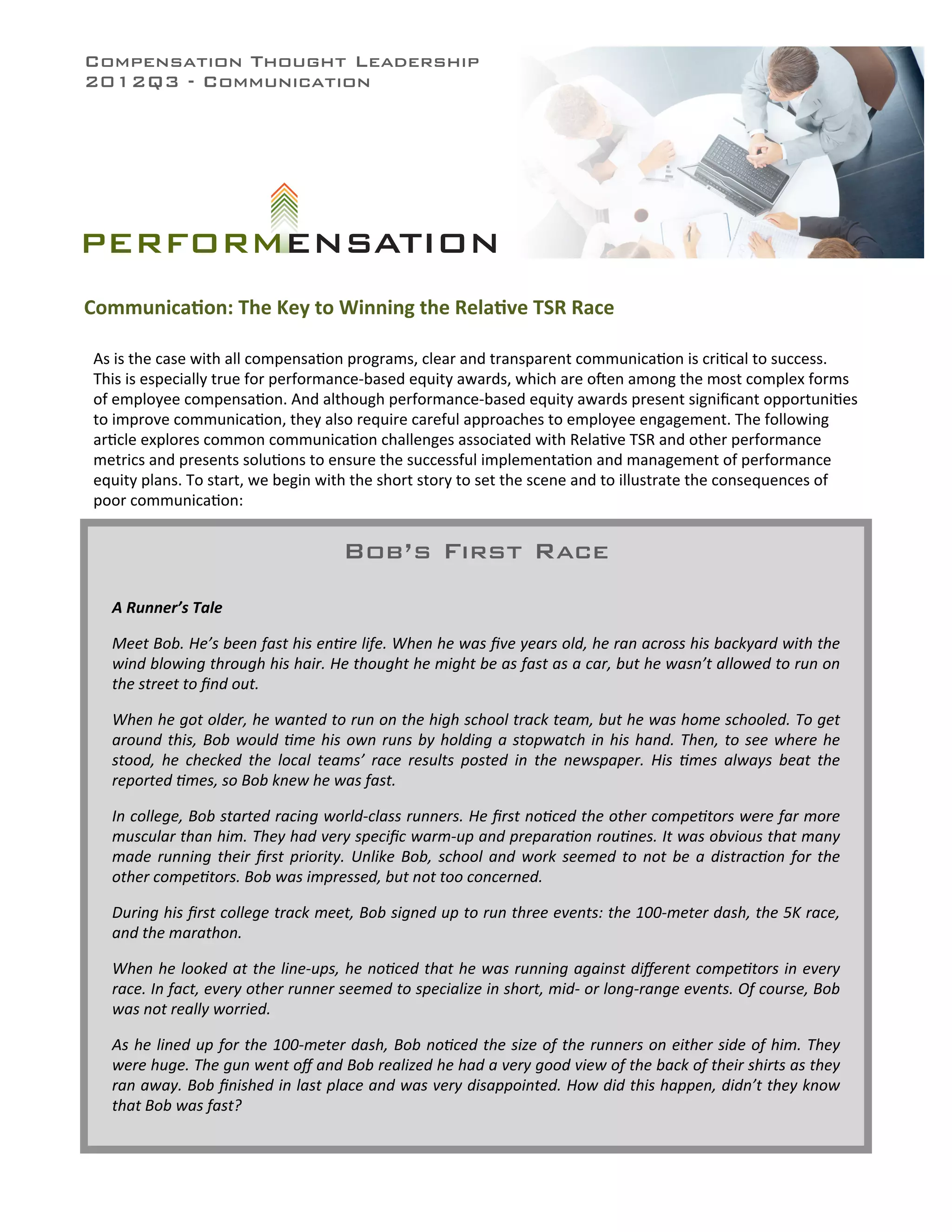 The document discusses the importance of clear communication for performance-based compensation programs. It uses the story of Bob, a runner who signed up for multiple races without understanding the differences in events or competitors. This resulted in Bob finishing last in the 100-meter dash. The document argues that with better information from leaders, Bob may have prepared differently and had a better outcome. Similarly, for performance equity plans to be effective, companies must communicate frequently to help employees understand complex performance metrics and criteria, as well as how they are progressing toward goals.