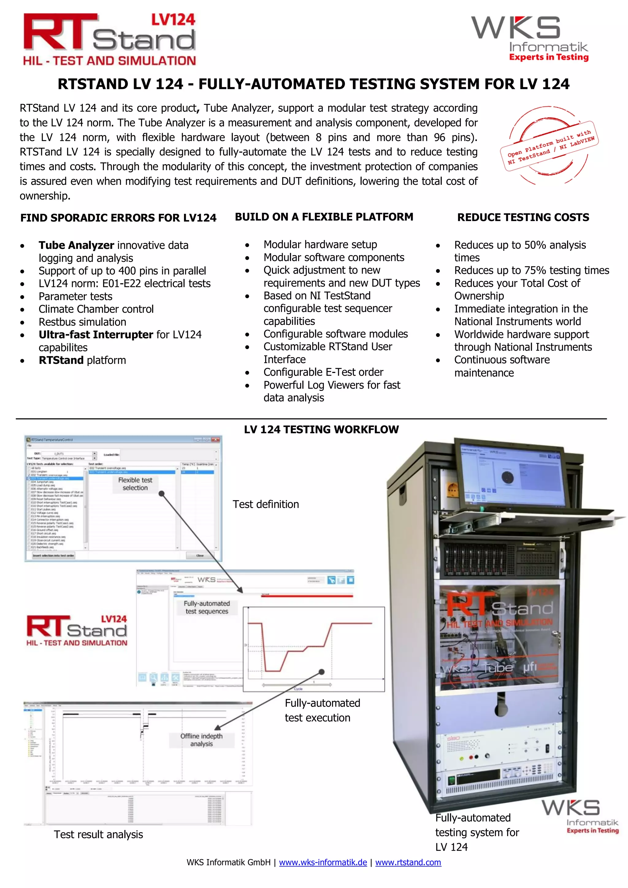 RTStand LV 124 is a fully-automated testing system for LV 124 that can find sporadic errors. It supports testing up to 400 pins in parallel and the electrical tests defined in the LV 124 norm. The system is built on a flexible and modular platform using NI TestStand and can quickly adjust to new requirements or device types. It reduces testing costs by reducing analysis times by up to 50% and testing times by up to 75%, while also reducing the total cost of ownership.