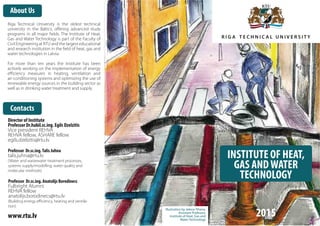Riga Technical University's Institute of Heat, Gas and Water Technology is the largest educational and research institution for heat, gas, and water technologies in Latvia. It offers advanced study programs at all levels (Bachelor's, Master's, Doctorate) in fields related to building energy efficiency, heating, ventilation, gas supply, water supply and wastewater treatment. The Institute has highly qualified staff and modern laboratories where students can gain practical experience in energy-efficient building and water technologies.