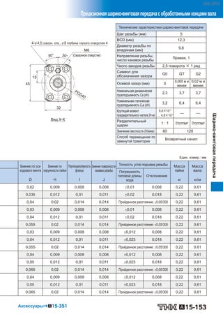 Документ содержит техническую информацию о шарико-винтовых передачах, включая номера моделей, размеры, шаги резьбы и характеристики грузоподъемности. Указаны детали точности, включая допуски и биения. Также включены схемы и информация о совместимых аксессуарах.