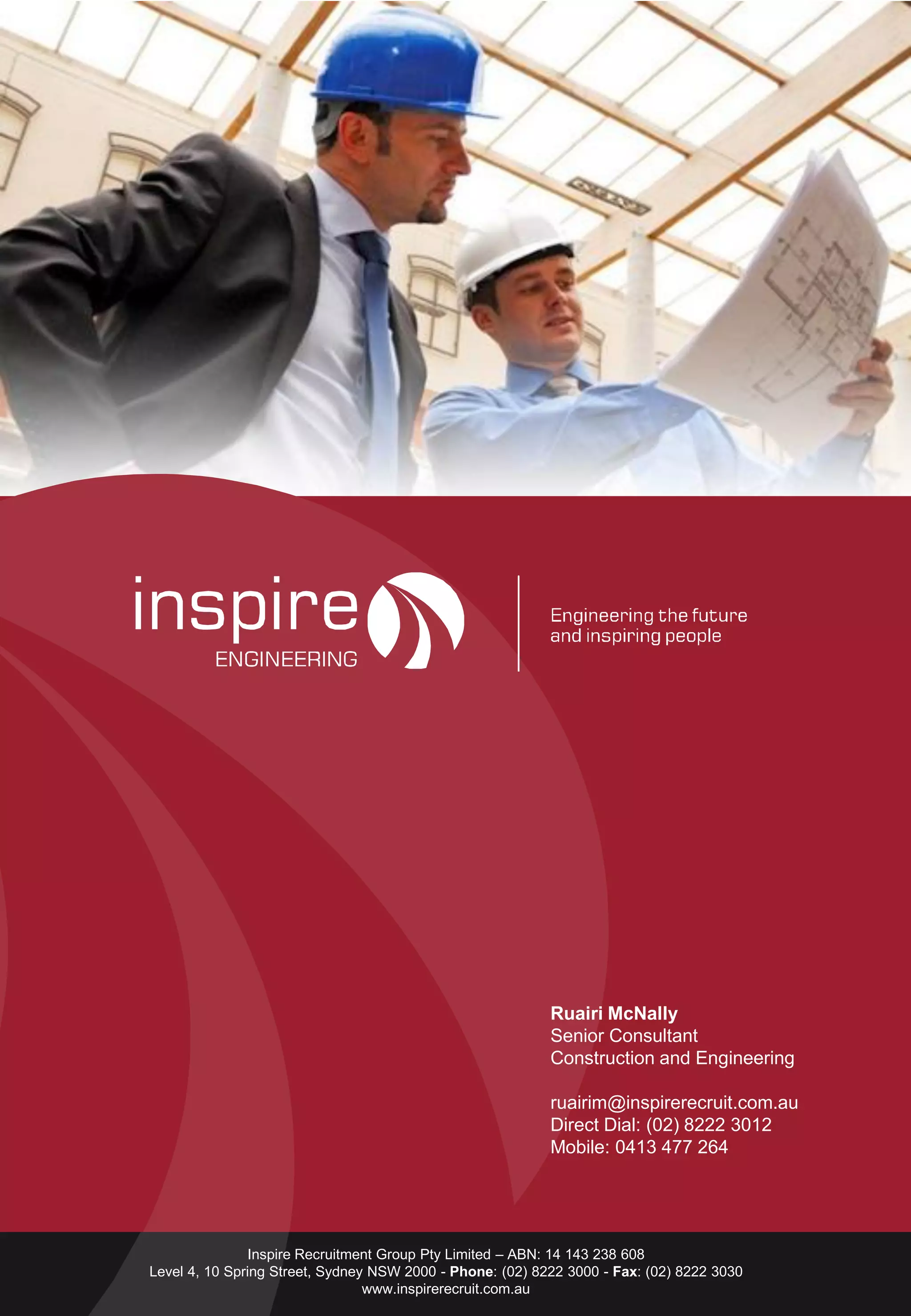 This document provides information about Inspire Recruitment Group, including their areas of expertise in construction, engineering, power, rail, oil and gas, and mining sectors. It introduces Ruairi McNally as a senior consultant with experience in construction and engineering in the UK and Australia. It also mentions Emma Hudson as a principal consultant with experience in starting up recruitment brands in the UK and Australia.