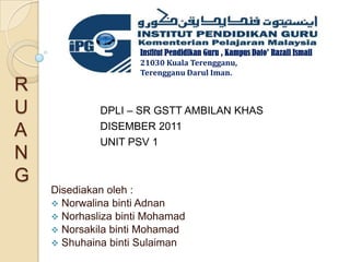 Dokumen tersebut memberikan ringkasan tentang konsep ruang dalam seni visual, termasuk definisi ruang, contoh penerapan ruang dalam seni arca dan grafik, serta jenis-jenis ruang seperti ruang fizikal, ruang ilusi, dan hubungannya dengan unsur-unsur lain seperti bentuk dan perspektif.