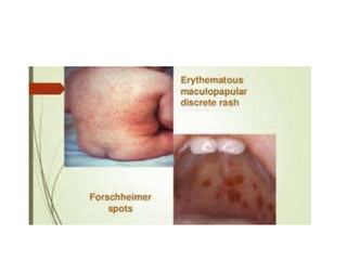 Rubella, also known as German measles, is caused by the rubella virus and can lead to congenital rubella syndrome if transmitted during pregnancy. Symptoms include a maculopapular rash, fever, and respiratory issues, appearing 14-21 days post-infection. Prevention is through vaccination, and while treatment is generally supportive, severe cases can result in serious complications such as deafness and cardiac defects.