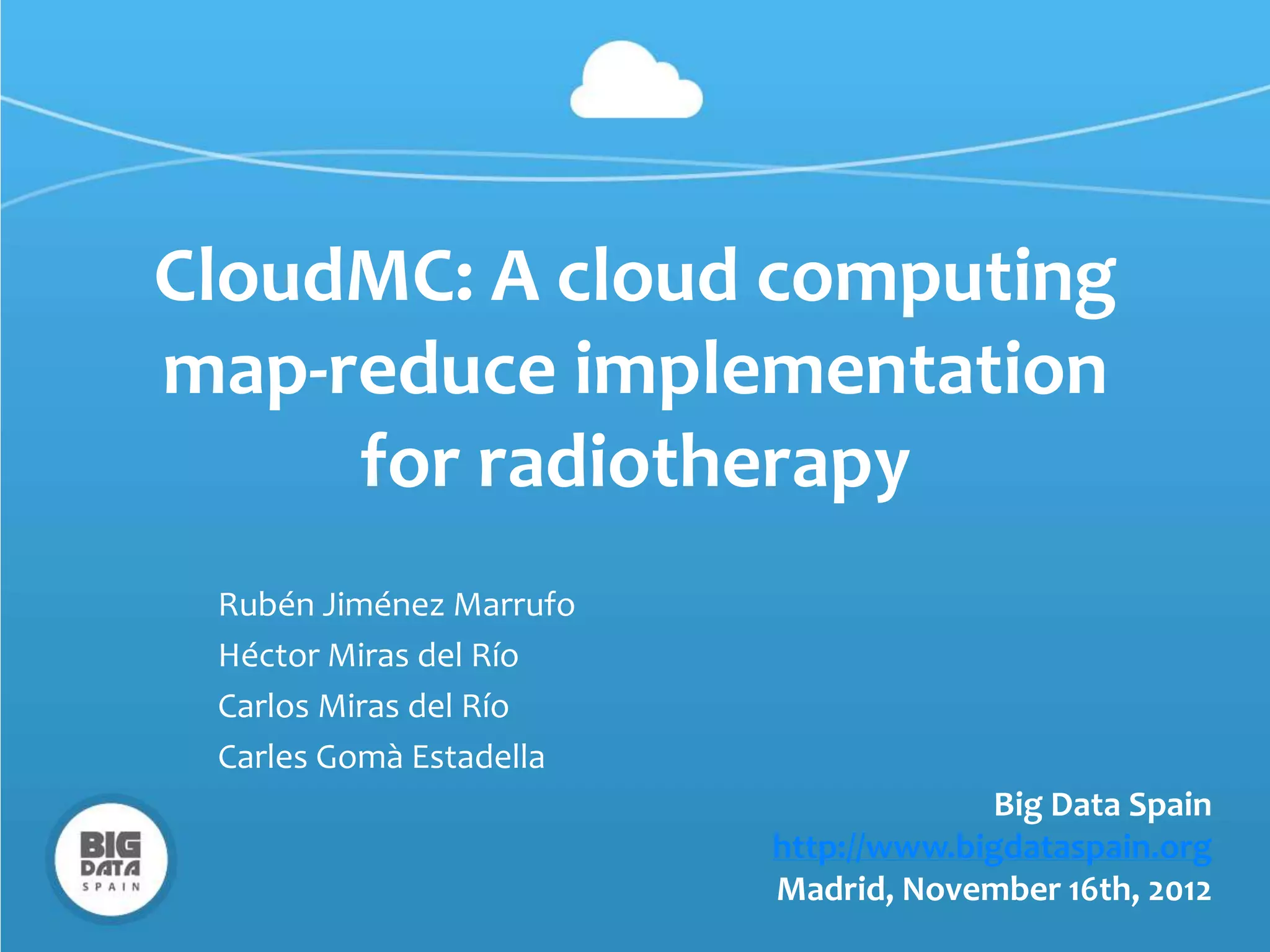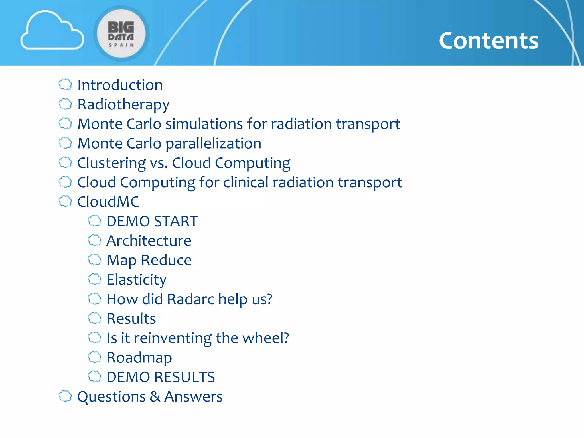 The document discusses CloudMC, a cloud computing implementation for parallelized Monte Carlo simulations used in radiotherapy for cancer treatment. It outlines the architecture and functionality of CloudMC, including its MapReduce capabilities and elasticity for resource allocation. The results demonstrate significant speed improvements in simulations when utilizing multiple instances, highlighting the benefits of cloud computing for clinical applications in radiation transport.