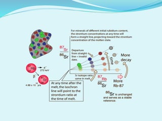 This document discusses rubidium-strontium dating, a radiometric dating technique that determines the age of rocks based on the radioactive decay of rubidium-87 to strontium-87. It describes the chemical properties of rubidium and strontium, how their relative abundances can vary in different rock types, and how the decay of rubidium-87 to strontium-87 can be used to calculate the age of a rock sample. It also discusses sources of error and applications of rubidium-strontium dating.