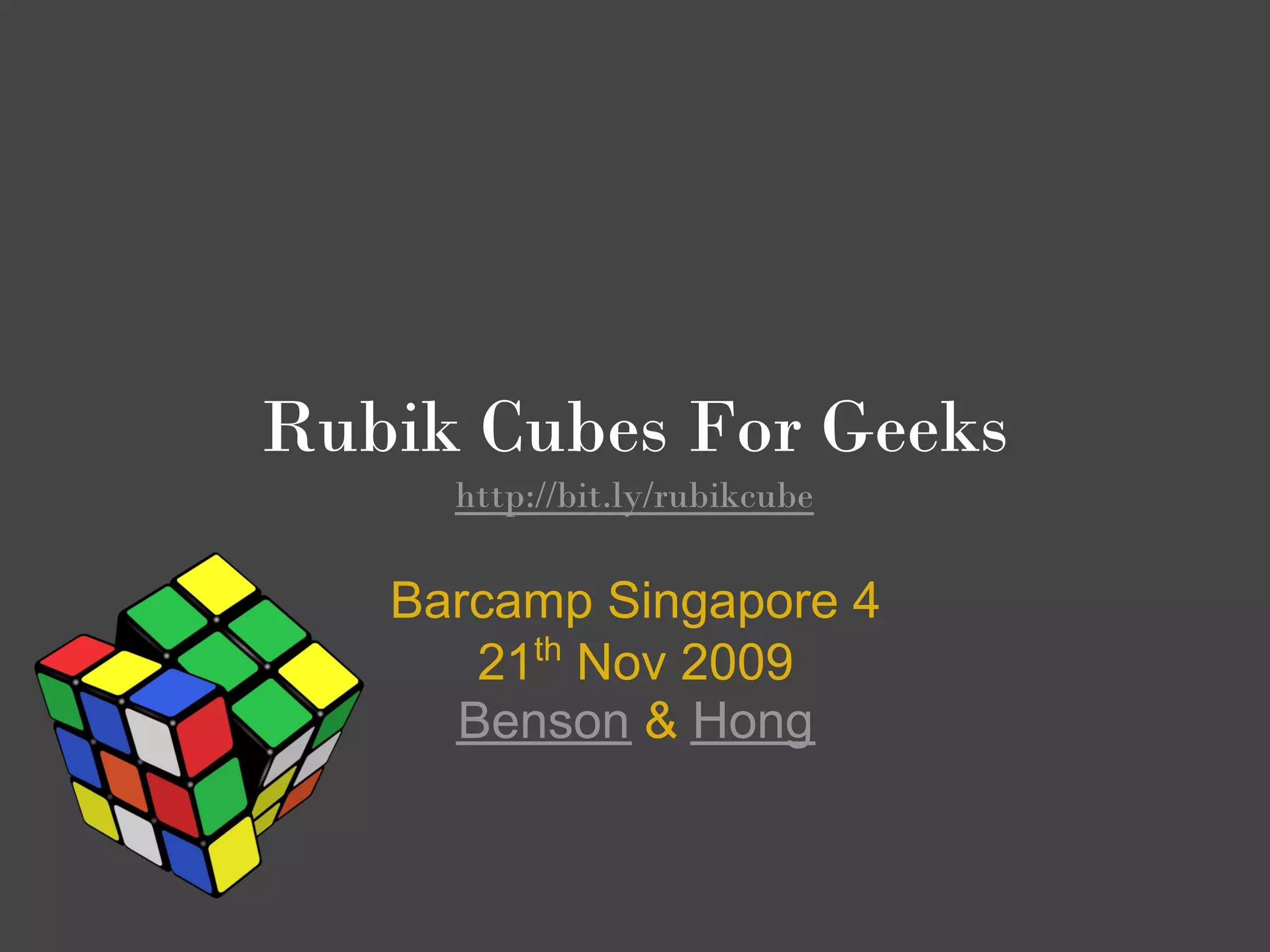 The document discusses Rubik's Cubes, including their origin and structure. It provides an overview of common solving techniques like the Fridrich and Lars Petrus methods. It also covers speed cubing competitions and how they are organized by the World Cube Association.