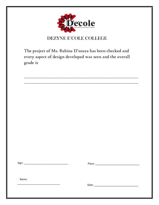 The document is a project report submitted by Ms. Rubina D'souza for the completion of her BS.c. in Interior Design program at Dezyne E'cole College. It includes the design of a Chinese-inspired commercial restaurant located within a hotel. The concept draws from traditional Chinese architecture, utilizing wood and an open layout with a water body view. Drawings show the restaurant's square structure, thatched roof, sectional views, and furniture plans laying out over 40 seats. Materials included in the design take cues from common Chinese motifs and colors.
