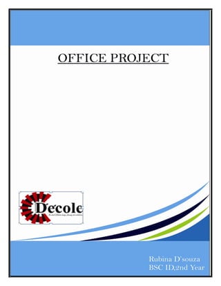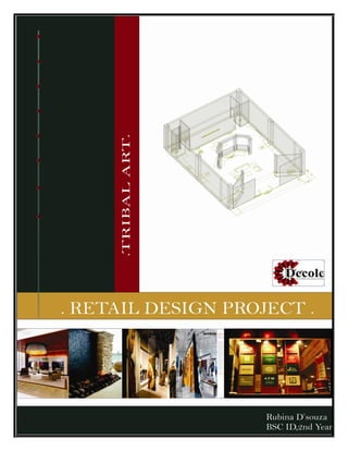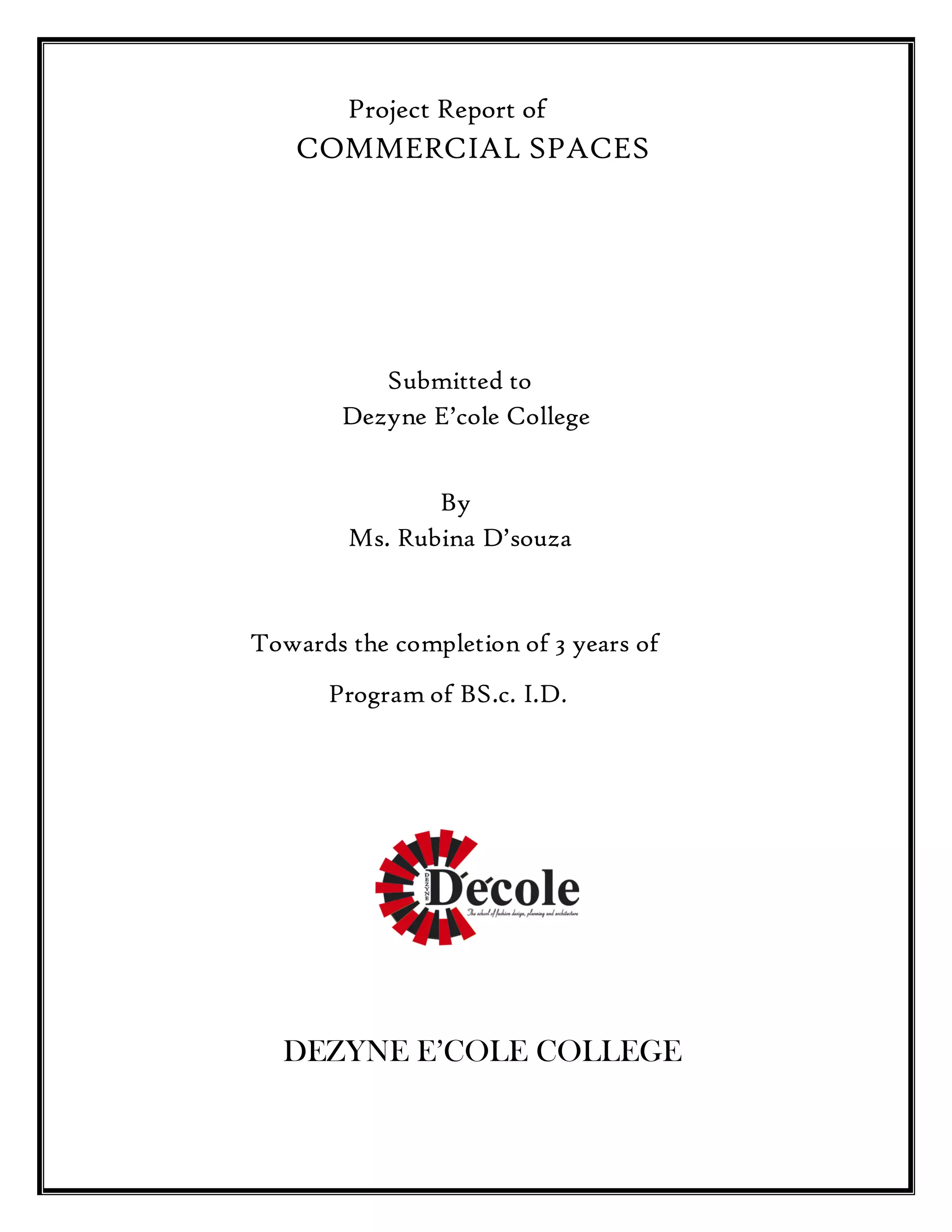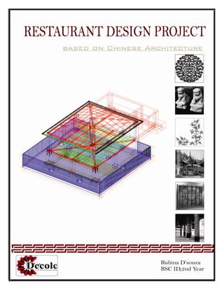 The document is a project report submitted by Ms. Rubina D'souza for the completion of her BS.c. in Interior Design program at Dezyne E'cole College. It includes the design of a Chinese-inspired commercial restaurant located within a hotel. The concept draws from traditional Chinese architecture, utilizing wood and an open layout with a water body view. Drawings show the restaurant's square structure, thatched roof, sectional views, and furniture plans laying out over 40 seats. Materials included in the design incorporate motifs and elements common in Chinese architecture.