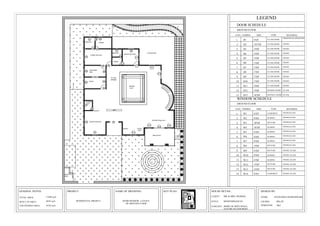 The document provides a door and window layout for the ground floor and first floor of a residential project. It includes a legend and schedules listing each door and window with its size, type, and material. There are 13 doors and 14 windows scheduled for the ground floor and 25 doors and 22 windows scheduled for the first floor. General notes at the bottom provide the total area, built up area, and uncovered area of the project.