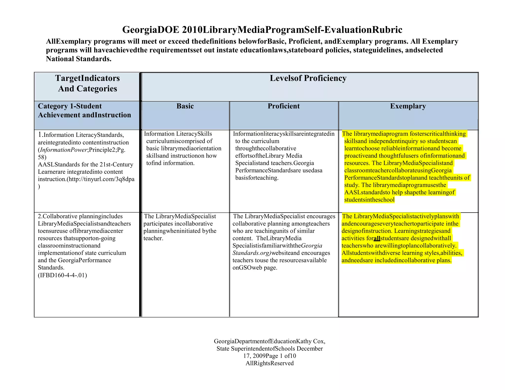 The document summarizes levels of proficiency (basic, proficient, exemplary) for a school library media program self-evaluation rubric across several categories including student achievement and instruction, staffing, facilities, access, and resources. An exemplary program meets or exceeds all criteria for basic and proficient programs and fully integrates information literacy standards into content instruction through collaborative planning between library staff and teachers.