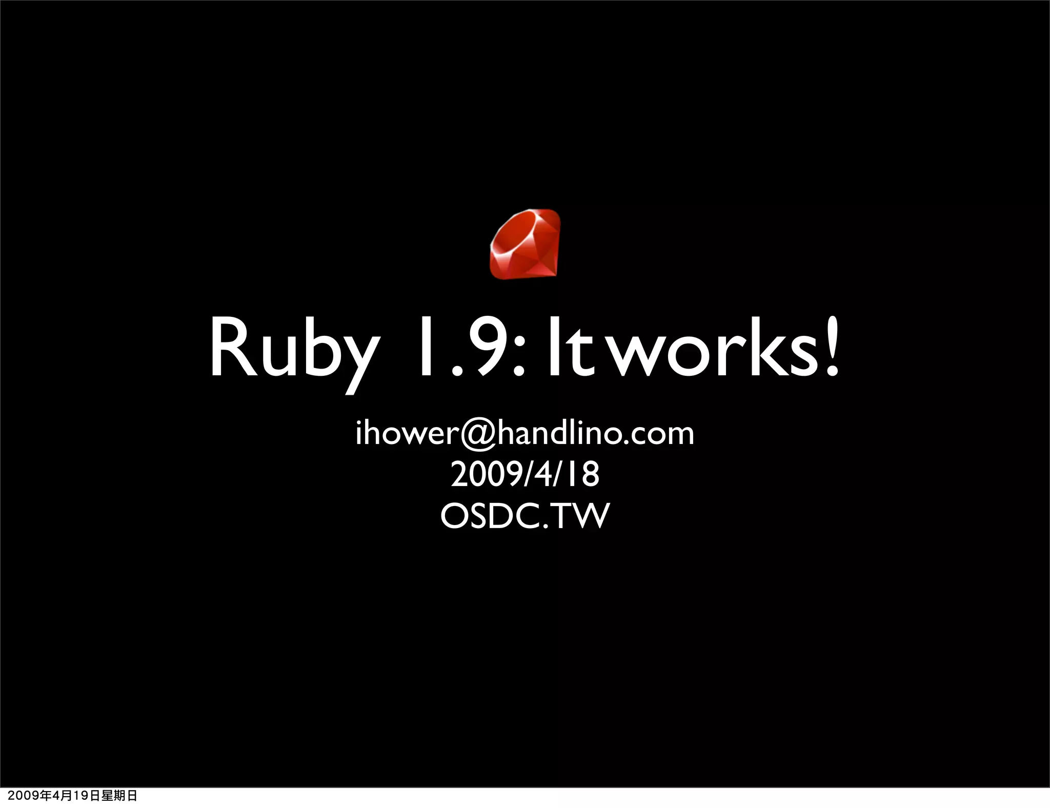 The document summarizes changes between Ruby 1.8 and Ruby 1.9. Key changes include ordered hashes, new hash syntax, external iterators using Enumerators, better encoding support through M17N, and changes to the threading model. The document provides an overview of Ruby 1.8 vs 1.9 and dives into specific changes like new syntax, library changes, and new features in Ruby 1.9 like external iterators and improved internationalization support.