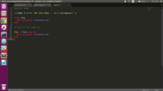 This document provides an overview of the Ruby programming language, including: