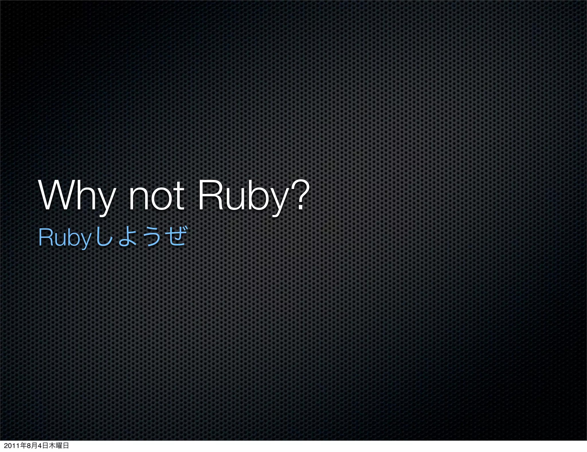 The document discusses the Ruby programming language, noting that it was created in 1995 by Yukihiro Matsumoto and has since grown in popularity with numerous frameworks and libraries like Ruby on Rails. It highlights several key features of Ruby including its syntax, object model with mixins, blocks and iterators, and emphasis on productivity with practices like test-driven development.