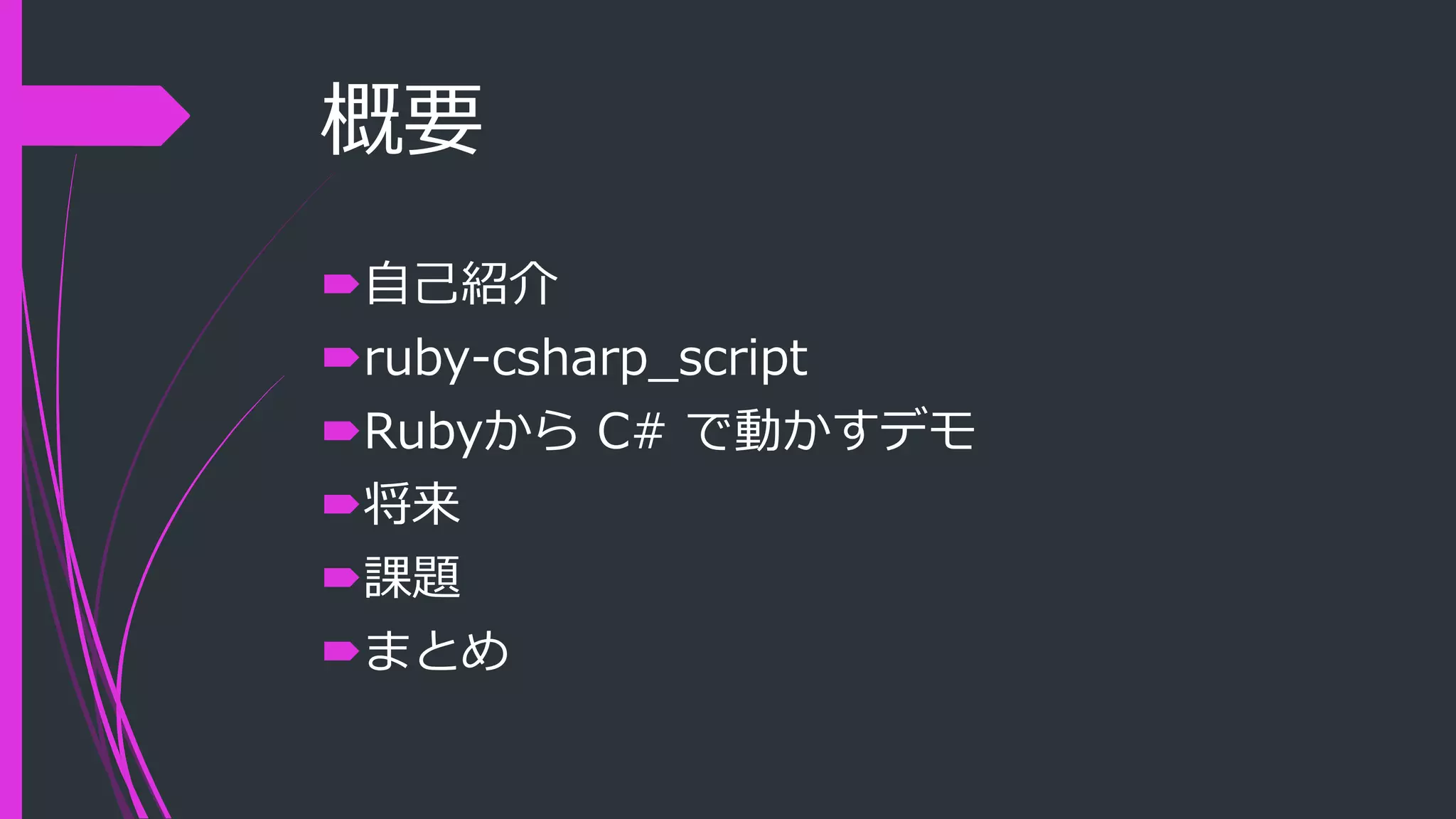 概要 自己紹介 ruby-csharp_script Rubyから C# で動かすデモ 将来 課題 まとめ