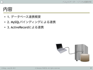 Rubyとデータベースとの連携技術 内容 ● 1. データベース連携概要 ● 2. MySQLバインディングによる連携 ● 3. ActiveRecordによる連携 K-Ruby, July 28, 2011 © Tamotsu FURUYA, All rights reserved. 2