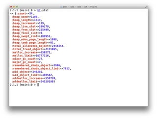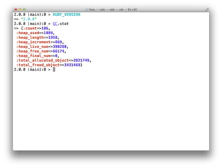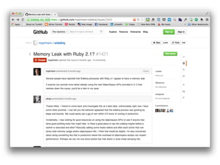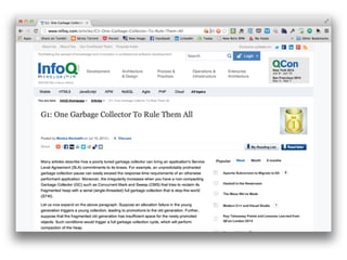 O G1 GC é um coletor de lixo paralelo e incremental que oferece tempos de pausa mais previsíveis em comparação com o CMS GC. Ele utiliza um ciclo de marcação paralelo e multi-fásico, permitindo trabalhar com heaps maiores enquanto mantém tempos de pausa razoáveis. A apresentação discute também aspectos e configurações do gerenciamento de memória e coleta de lixo no Ruby.