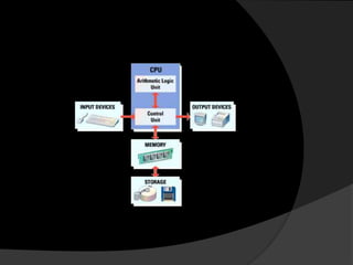 The CPU contains two main components - the control unit and the arithmetic logic unit. The control unit coordinates all computer activities and passes instructions to the ALU for arithmetic and logic operations. The CPU also contains registers for temporarily storing instructions and data during processing. Common types of memory include ROM for basic input/output and RAM for user programs and data, which the CPU can access much faster than the hard disk. Major CPU manufacturers include Intel, AMD, and Motorola, and some important CPU models introduced over time are the 8086, 80286, 80386, 80486, and Pentium.