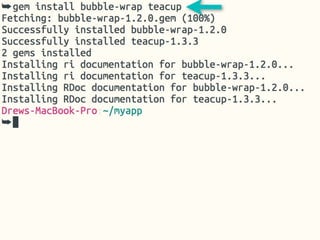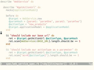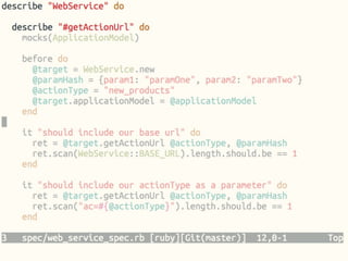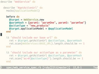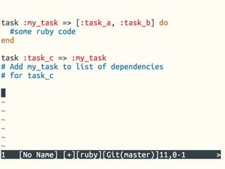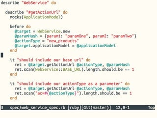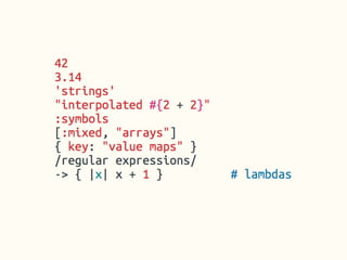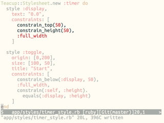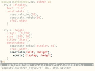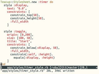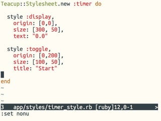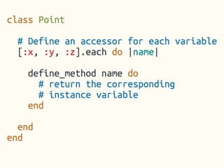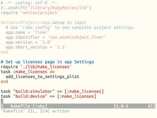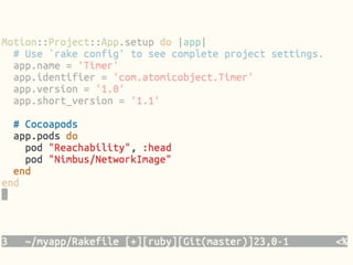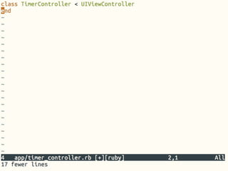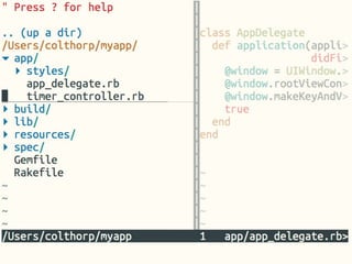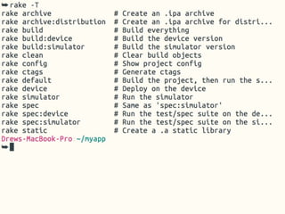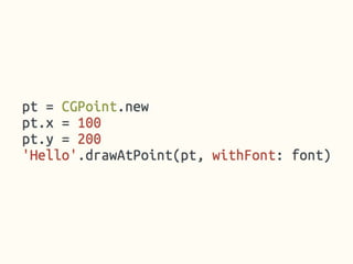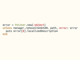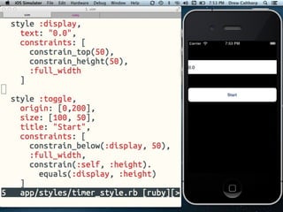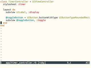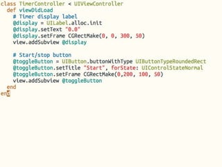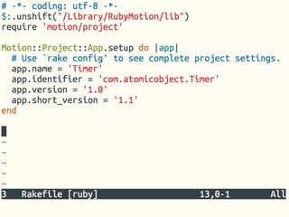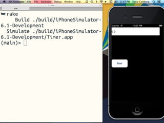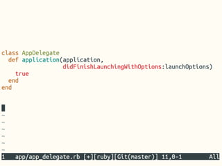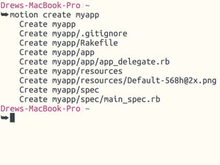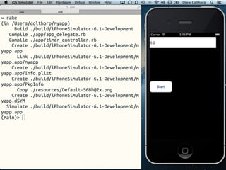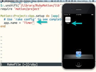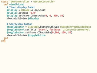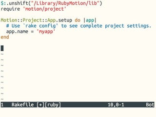 The document discusses RubyMotion, a Ruby implementation for iOS development that offers a flexible syntax and object model similar to Objective-C. It highlights features like garbage collection, method invocation syntax, and the integration of Ruby's capabilities in creating internal DSLs. The document also touches on the REPL (Read-Eval-Print Loop) context changes while interacting with UI elements in the simulator.