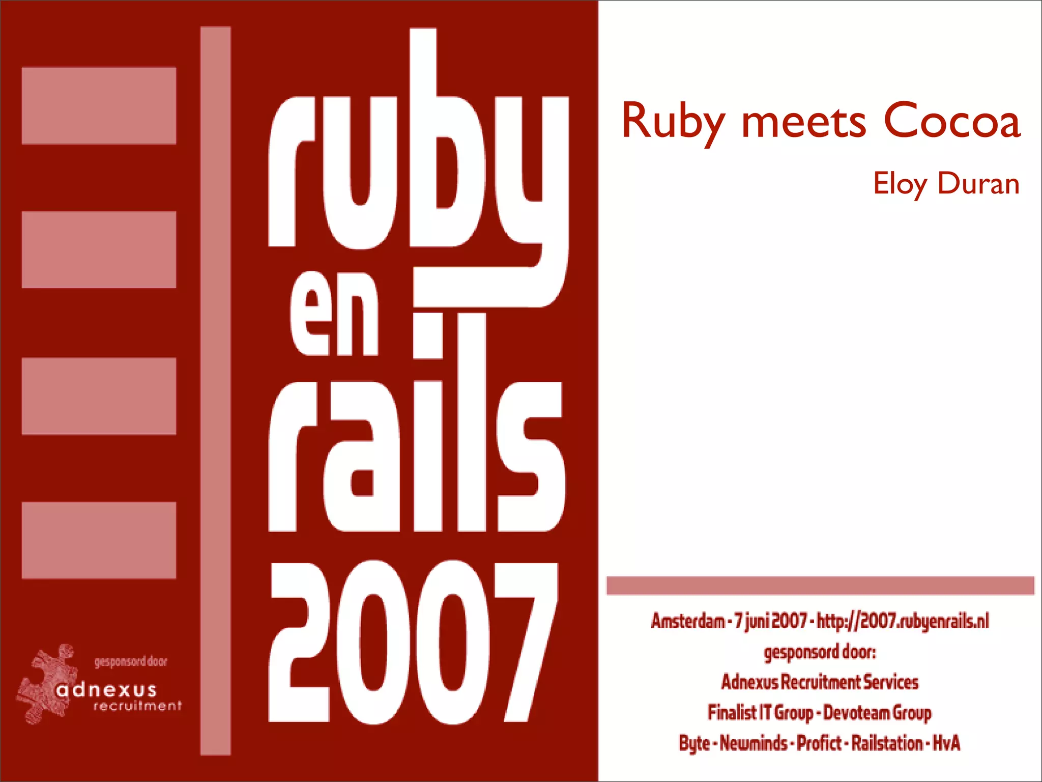 The document discusses RubyCocoa, which bridges the Ruby and Objective-C programming languages allowing Ruby code to access Cocoa frameworks, describes its history and key contributors, and provides an example of how RubyCocoa allows Ruby code to call methods on Objective-C classes similarly to how it is done in Objective-C. It also lists additional resources for learning more about RubyCocoa, Cocoa, and Objective-C.